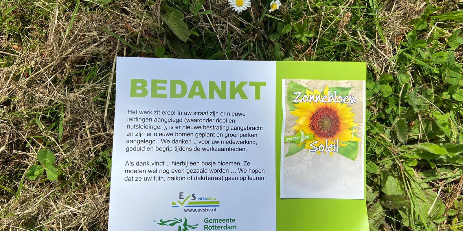 Om de bewoners te bedanken voor hun geduld tijdens het project hebben de omgevingsmanagers van EVS infrabouw een presentje uitgedeeld namens de Gemeente Rotterdam en EVS infrabouw.